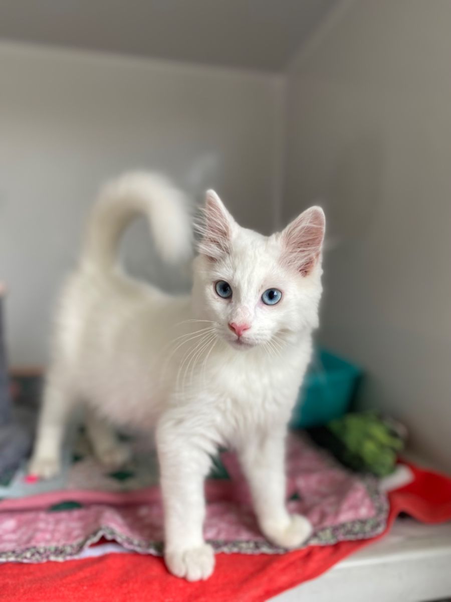 Meet Milky! This 16 week old White Female Domestic Medium Hair Kitten is a gentle and sweet soul. She loves to purr, and is always ready to show off her playful personality. Milky’s beautiful white coat requires her to be an indoor cat to avoid skin cancers, but that never stops her from having fun!
