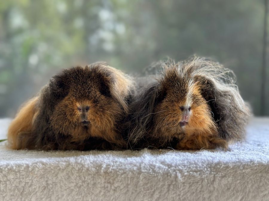 Please note: Both girls have very long hair and will need to be housed on absorbent bedding e.g. Wood shavings/fleece/ up off the ground.