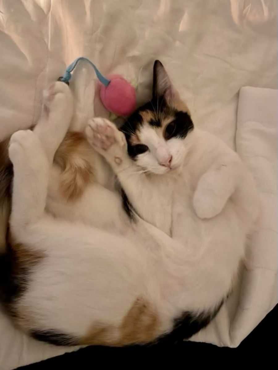 Little Topsy is a cutie! Loves to sleep with you on the bed and is being fostered with children :)