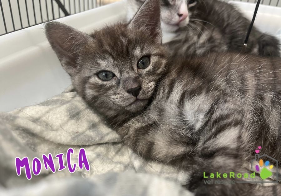 Monica is a 3 month old female Domestic Short Hair in need of a loving home. This cheeky and playful kitten loves to get into mischief, but she also has a sweet side; she's a smoochy lovebug who loves to cuddle with her family. Monica is an inquisitive and active girl who loves to explore and play.