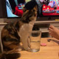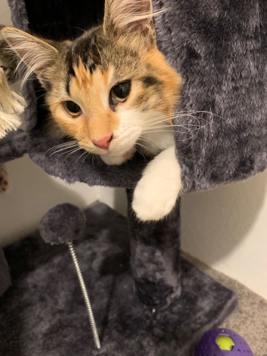 Pretty calico girl who may cheekily drink from your own water glass.