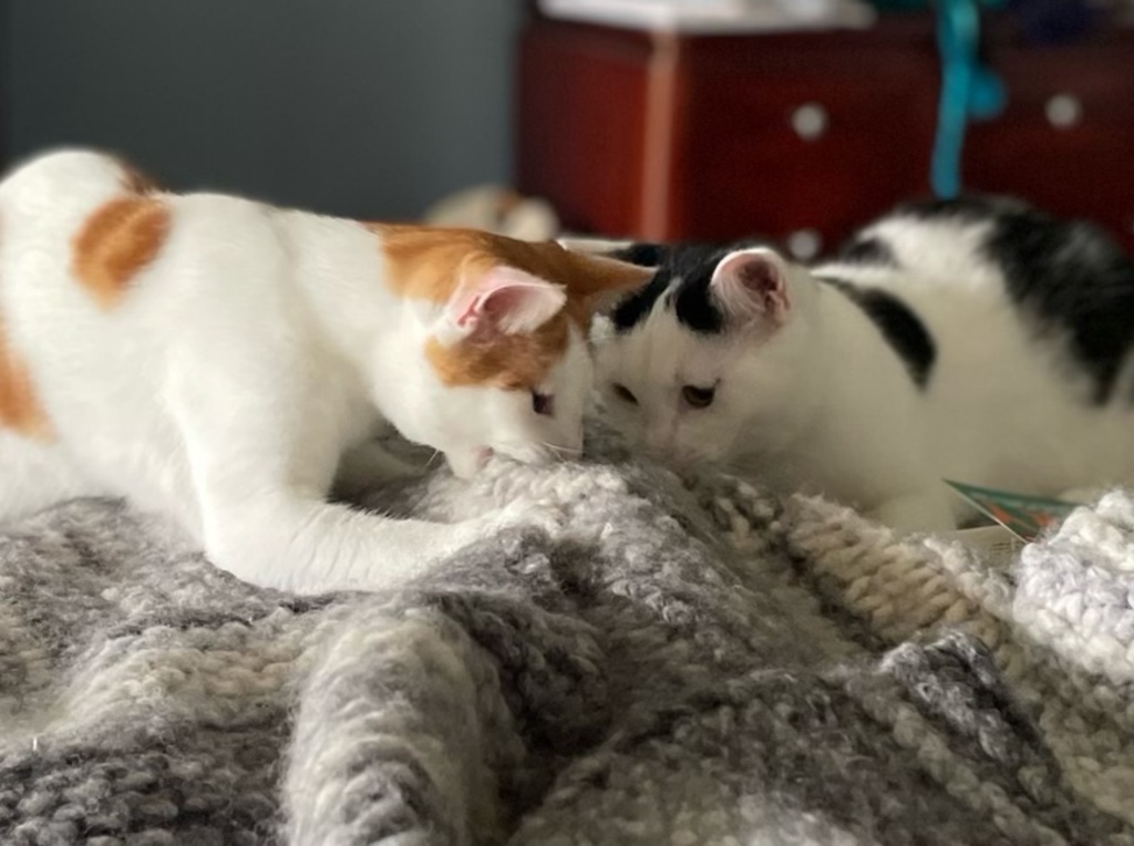 Waffles is our more adventurous boy and Mowchi is our more cautious one. Once they get to know you they are a really sweet combination.