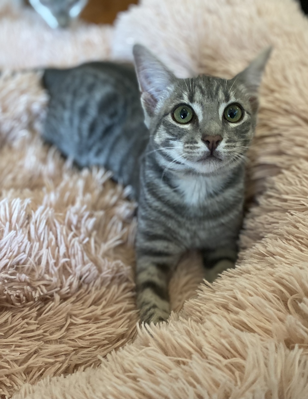 What can we say other than this is one beautiful tabby. Rather than your standard grey she is a soft powder or dilute grey. She is also extremely entertaining. We have nicknamed her swiper and in a flash back to the Dora the explorer days seem to spend our days saying Swiper no Swiping! She uses her soft paws not claws so its a batt not a real swipe but she loves to swipe the other kittens when she plays and hide under the lounge and swipe at the cats as they go past. She is endlessly entertaining :-)