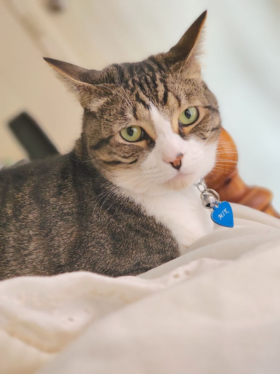 One of Mik's most endearing quirks is his love for giving forehead kisses, which will always put a smile on your face. He's also a happy and loving cat who enjoys being fed, playing with new toys, and exploring new spaces.