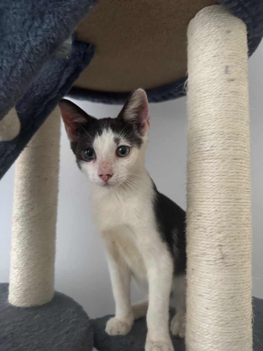 Look at him now! He’s loving the cat tree and doing zoomies around the house now that he can play with the other kitties too. He’s so cuddly and can’t WAIT to find his forever home.