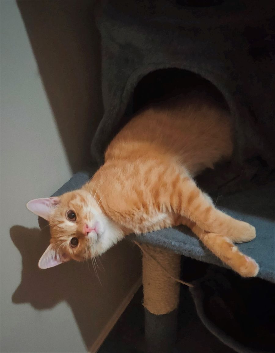 When he and his brothers aren’t in the mood to give each other loving baths before sleepy snuggles, he likes to curl up in his snuggly furry cat bed and make biscuits (kneading). He also likes to go on adventures and explore every nook and cranny, including sneaking into open kitchen cupboards when given the chance, must watch out for that because he is quick and may have once gone unnoticed in a closed pantry for a minute or two. He wasn’t at all worried I still had to coax him out, I think he would have preferred for me to close the door again so he could continue getting up to mischief.