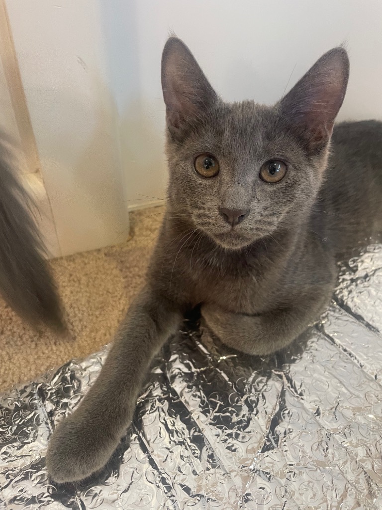 Squeaker has sleek grey fur and looks like she needs a good feed, but looks are deceiving.....Squeaker absolutely loves food, eating her food and any food leftover by her siblings, along with her foster brothers' food....she just can't get enough!