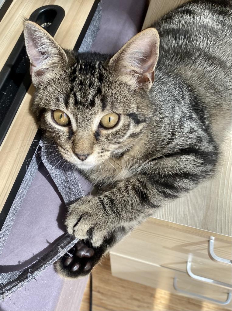 Maddox is four months old. He takes a little bit of time to decide that hoomans are ok, but once he does, he will sit on you and purr himself to sleep. He is a stripey dumpling of love, a plump gorgeous boy who will love you to bits.