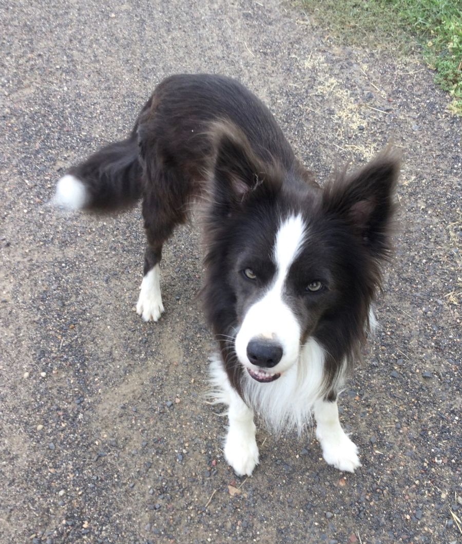 His colouring is more a mix of brown/blue and white, though he appears black and white in the photos.