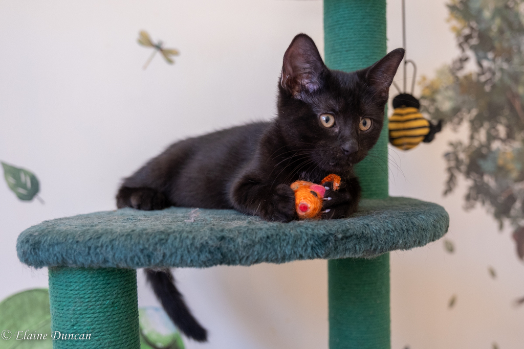Harlow's favourite toy is a little bubble bee kitten-toy she loves to play with, but she also loves to do zoomies around the house, playing with her siblings and speeding through the kitten tunnels. She can be easily won over to be your best friend with a little chicken or sardine treat and you will likely then have her curled up next to you or on top of you when it's nap time. At night she loves to sleep on her humans pillow, right beside their head!