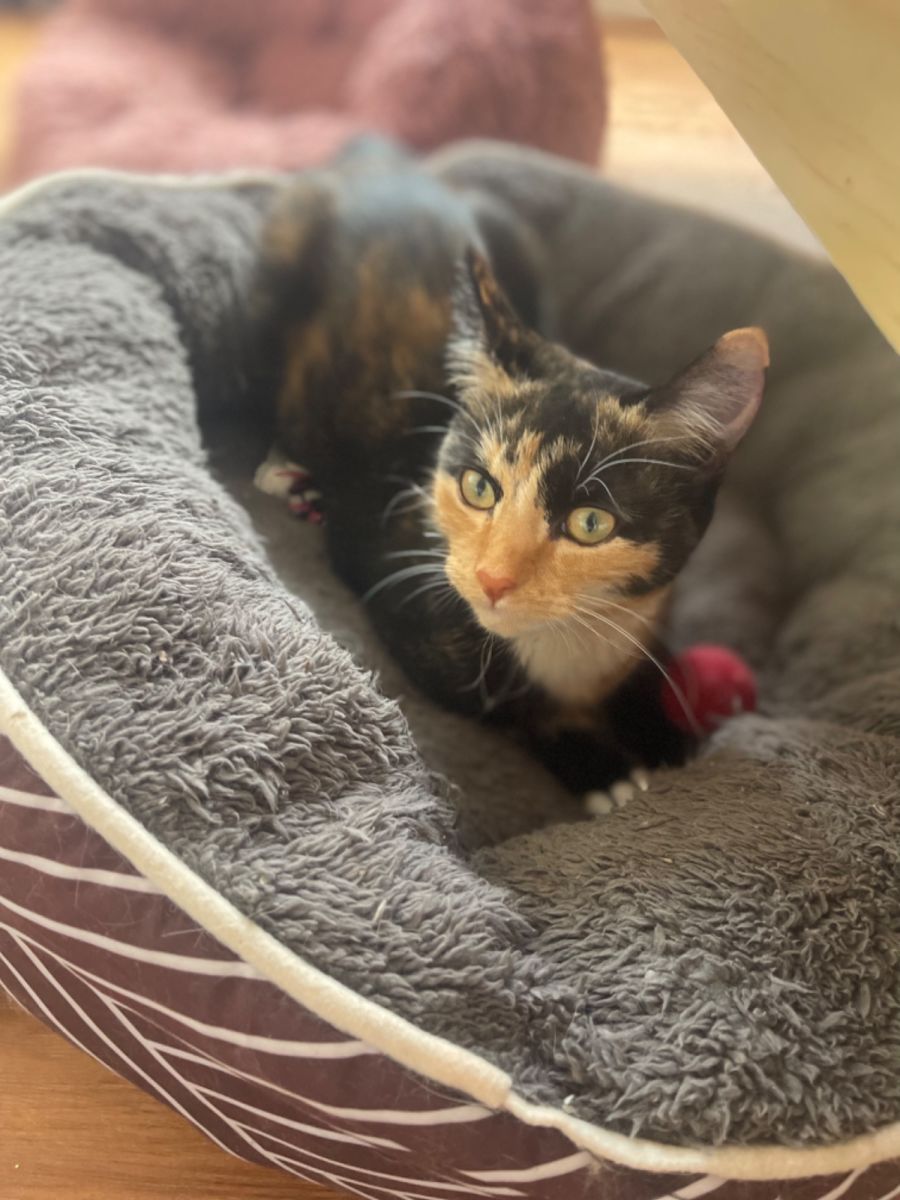 She is a quiet girl who doesn’t meow allot but she purrs!! Her purr is so loud she can be heard from across the room. She loves her people and being in their company but is also of the age and happy for you to go out for the day or off to work.
