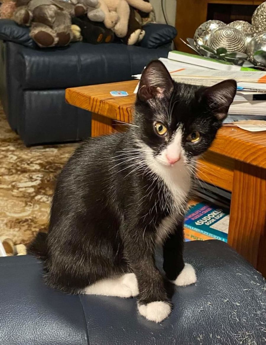 Nod is the smallest of the gang, but don’t let that fool you! He is always the first to get into mischief, and was the first to do all the things that kittens do – leaving the pen, exploring the house, and introducing himself to the resident cats. He is a very loving kitten, and likes to know what the family are up to when they are home. He loves to be cuddled and patted, and at the end of the day he can usually be found sleeping on his foster mum’s lap.