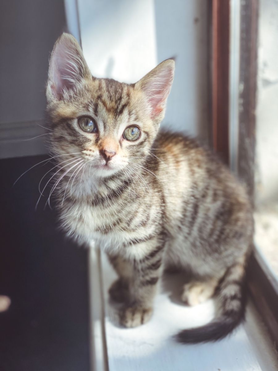 Kiana Is approximately 11 weeks old and came to care with her 2 sisters and 1 brother. Kiana was covered in fleas and had cat flu when she came in part of a street born litter of a stray mum.