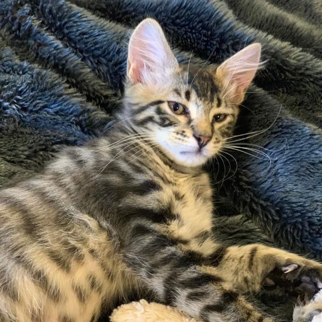 Bardock is placid soul. He is super handsome with his spotty tummy and has enormous paws so may grow to be a gentle giant. He loves the company of his human companions even over his siblings. Though he is the biggest of his litter, he is not bossy and will happily share his food with his much smaller litter mates. He may be initially scared of a fast moving outstretched hand but then is very quick to come up onto you for a pat. Bardock loves to sleep on a fluffy blanket, enjoying a leisurely pat while purring in his sleep.