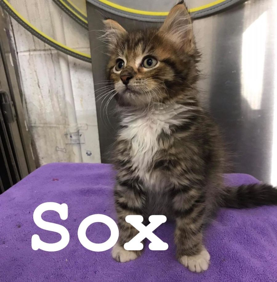 Tiger: this fireball of energy loves to play with his siblings, often trying to find the right time to pounce onto them. We would definitely recommend that he be adopted with another one of his siblings so he can have a feline friend to help exhaust his seemingly endless energy. In his downtime you’ll often see him cuddled up to his brother Sox.