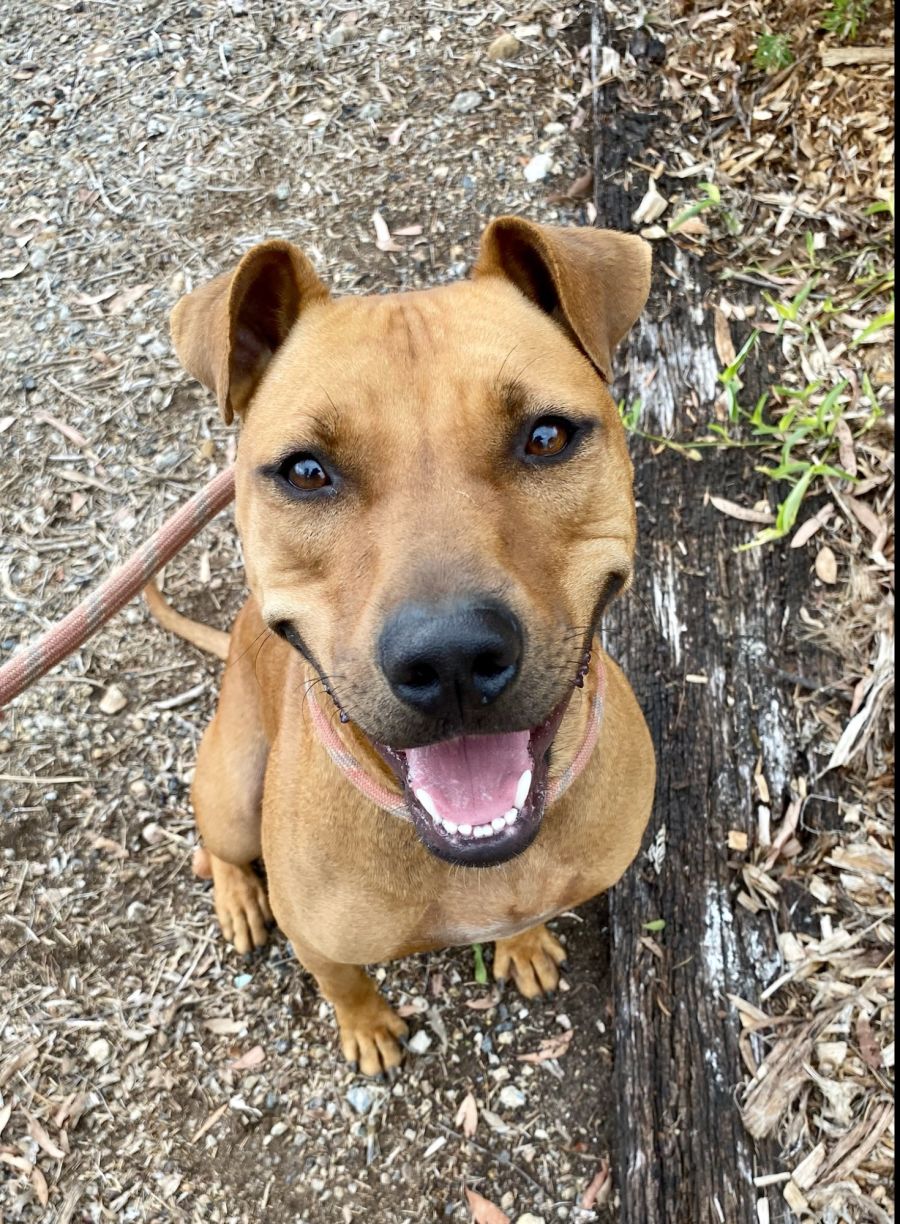 Ola is a Staffy X Kelpie mix who loves to get out and about! She enjoys taking long walks, meeting new people and being around other dogs. Ola can be quite excitable when she is first introduced to something, but it only lasts for a couple of minutes before she calms down and will just follow you around or relax in the sun. She knows basic commands such as sit and stay and walks well on the lead.