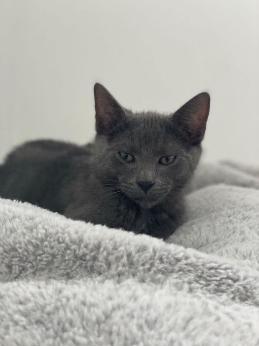Zoku is a stunningly beautiful grey kitten with a laid-back personality to match. He's a gentle soul who wouldn't hurt a fly and is often content to do his own thing. While he may not be the most outgoing of his litter, he's the leader of the pack in his own way. Zoku has a unique love for baths, and will happily hop into an empty tub to chase his own tail (without any water, of course). He's a very chill kitten who loves to relax and take it easy, but also enjoys playing and exploring when he's in the mood.