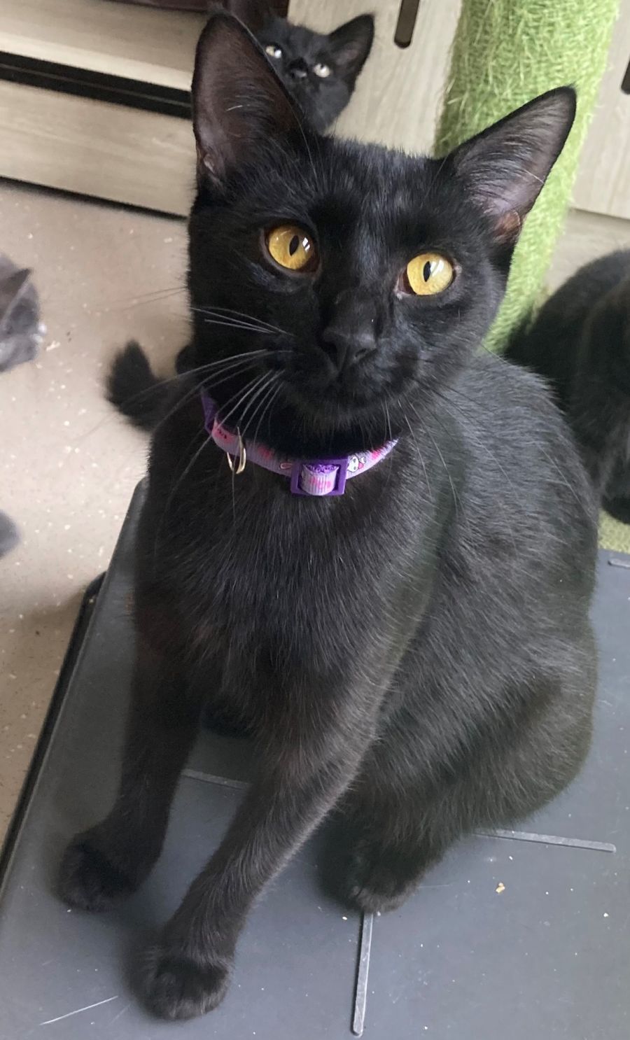 C1165 Teena is a beautiful, sleek young black cat who is very affectionate and is very easy going. She's a pleasure to be around! Once you meet her, you won't want to let her leave your side. This sweet girl is looking for her forever home, ideally with her beautiful sister and best friend C1166 Tracey. While they can be rehomed separately these two will bring so much love and joy into your home, and they will keep each other company while you are out. They love to cuddle and explore and play, so you'll never have a dull moment with them. Both Teena and Tracey will show you how much they appreciate being part of your family with lots of purrs, headbutts and smooches.