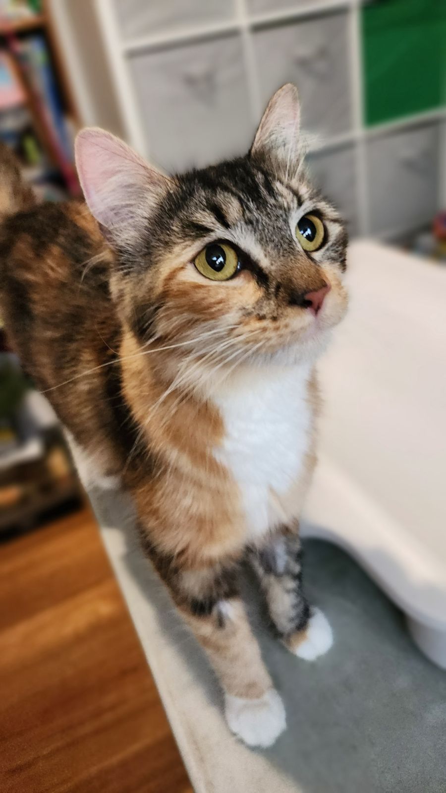 Meet Katie, a beautiful and cuddly cat who loves people, especially kids! She is incredibly friendly and loves nothing more than snuggling up with her favorite humans. Katie is a protective momma, so she may not be the best fit for a home with dogs. However, she has been known to be very gentle and loving when it comes to children – she will make the perfect companion for your family.