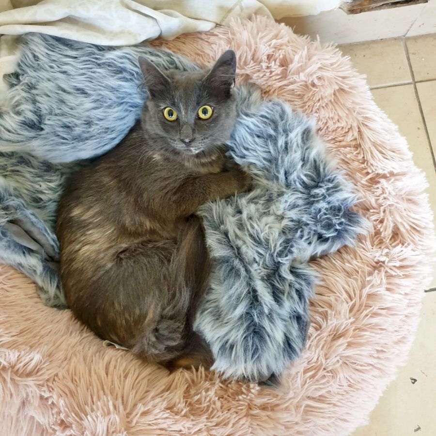 She is very playful and loves releasing her inner Spiderman by climbing up flyscreens. When she has finished playing she will quite happily sit on her carers lap. She will tolerate being picked up but would rather make her own way there.