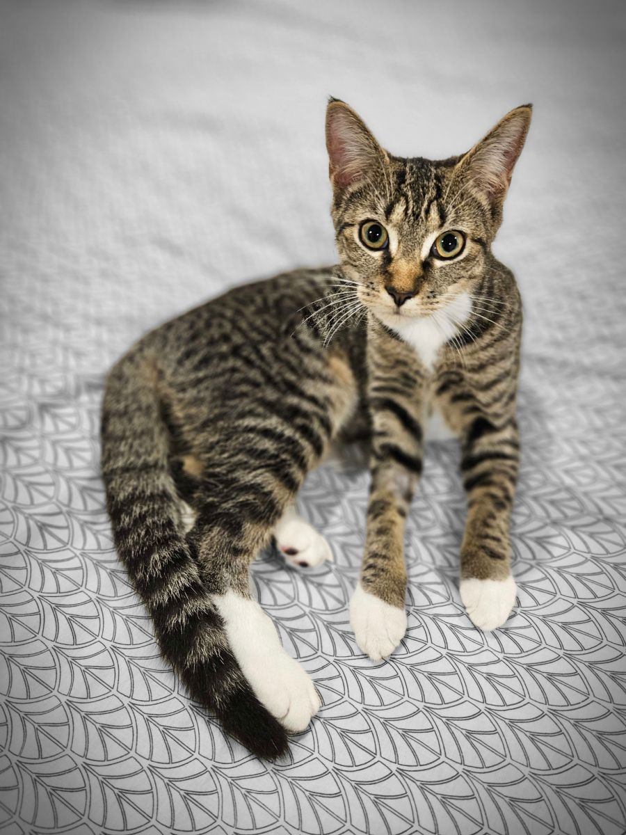 Puss is in foster care with her Brother Boots and they look so alike it is hard to tell them apart! She is a vibrant little thing who, when she's not playing with Boots, enjoys climbing onto the windowsills to watch the fun things outside (like birds). She loves getting pats and cuddles up to you with her soft purr.
