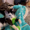 When she’s not having fun, KitKat can often be found snuggling up in bed or on the couch with her favorite humans, purring away as she falls asleep on their lap.