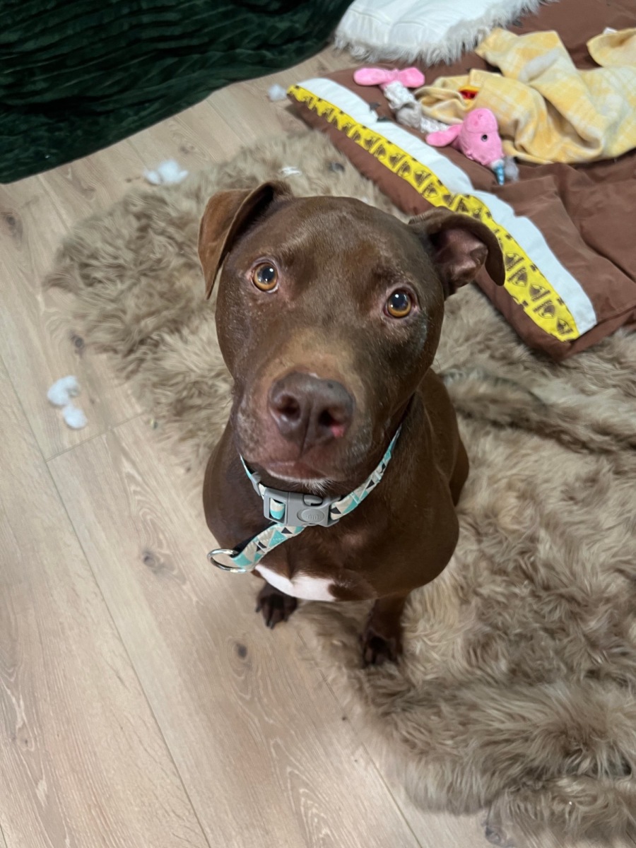 Hi everyone, my name is Bluebell and I think Im an 8 year old Amstaff x Sharpei. I have a wide nose, little pei ears and an upright tail.