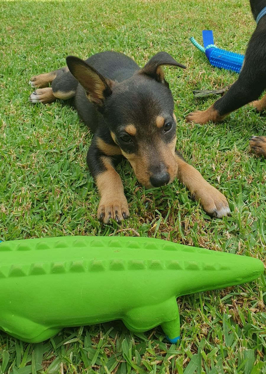 Meet Eabha (Ey-va), the mini Irish kelpie! She is a friendly and energetic pup who loves to learn. Smart as a whip, she already knows how to use the doggy door and can sit on command. Eabha is currently sleeping in a pen in the sunroom while she waits to be taken outside for toileting.