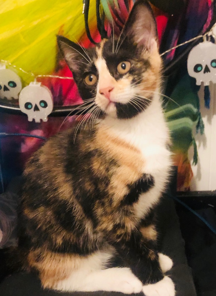 Cookie is a six month old tortoiseshell kitten with a white nose. She is a little ball of energy, she's the crazy little rebel of the household, if anything gets knocked over or pushed off a table you know it's always Cookie that did it! She will do zoomies around the house like a little lightning bolt and she will pull toys off the shelf like a tornado. When she's used up all her energy she likes to lay at the windows and watch the birds or have a snuggle with a human or another cat and have a sleep.