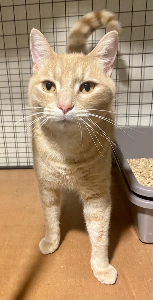 This delightful boy is a very chill kitty with adults, and he'll show you so much love as soon as he meets you. His head bumps are in endless supply, and he's a HUGE fan of belly rubs. He used to be chonky but he's slimmed down with all the exercise, but still won't say no to any food you give him - his big amber eyes are hard to resist.