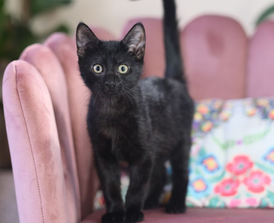 Sammy is a handsome kitty. Dark and mysterious, his big green eyes will capture your heart. He loves bounding through the cat tunnel, climbing and playing with his litter mates. Although he would love a feline friend, he is also independent enough to be a solo cat. He would be fine with children over 5 or a home with a dog. Sammy makes his foster mum laugh the way he climbs up her arm and perches on her shoulder. Sammy would be fine to be an outdoor/indoor kitty.