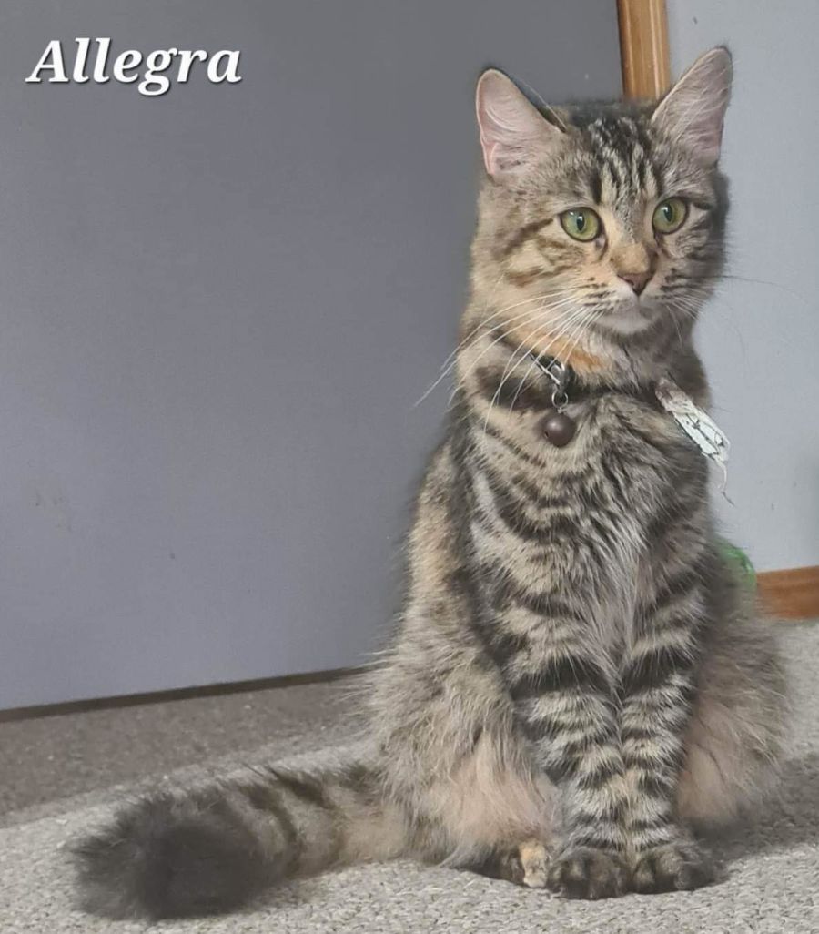 Meet Allegra, the fun loving tabby cat! She is 1 years old and full of love and energy. Allegra loves to play, snuggle and explore her surroundings. She has a fluffy tail that she likes to show off when she's feeling extra playful. Allegra is litter trained, vet checked and gets along with children, cats and dogs alike. She is looking for a forever home where she can express her joy for life in all its forms!