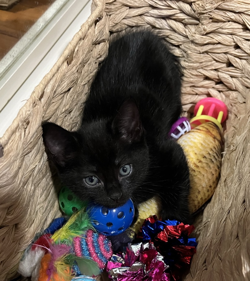 Ebony is very curious and a determined little girl (She was the runt of the litter). She has a sweet nature and enjoys playing with toys (balls with bells, cloth mice, tunnels, and other soft toys) and wrestling, playing with her Mum and siblings. She likes to explore, likes pats, and likes to be held sometimes, and other times to just be near you or off playing. Ebony has been desexed, vaccinated, microchipped, flea and worm treated.