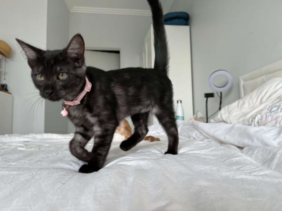 Corinne loves to climb cat trees and explore her surroundings. But she also has her routines, often going for long naps in the afternoon in her favourite spots in the house. She loves wet and dry kitten food, is litter-trained and quiet. She will run to you when you enter the room but she can also be left on her own as long as she has kitten toys to play with.