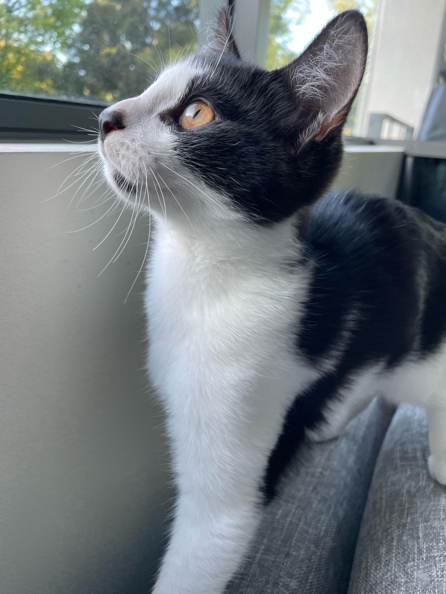 Rocky is a beautiful black and white kitten with the cutest black nose. He’s full of energy and curiosity but also a fan of a good nap on the couch. He loves exploring his surroundings, chasing after toys, and wrestling with his sister. He's always ready for a cuddle session and will happily curl up on your lap or sleep by your feet while working.