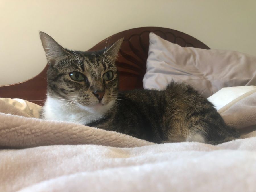 Leyla has a beautiful tabby coat, a golden hue to her face, a graceful and expressive tail and curious ballerina-like turnout to her back legs.