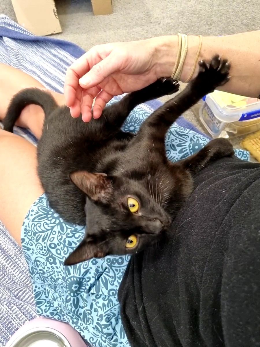 Samba is a cute black kitty who may be shy at first, but once he warms up to you, you'll have a new best friend. Samba loves affection and belly rubs more than anything else in the world. He will throw himself onto the floor for extra pets, and he's very food driven! He would do well in a quiet home with someone who is willing to give him all of the love and attention he deserves.