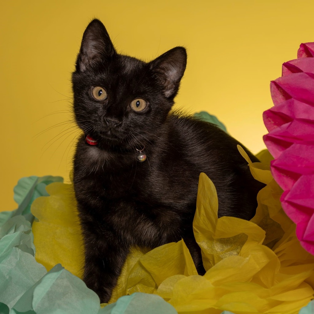 Bat is a playful and fun kitten who loves his toys and enjoys chasey with his siblings. He is all black with white flecks on his belly. This sweetie has been bottle fed since 2 weeks old and is therefore used to being handled and also picked up for a cuddle by gentle children.