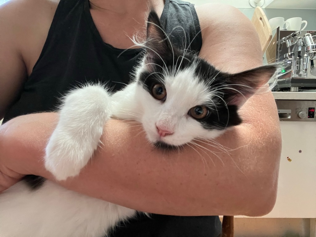 Malty is a six month old domestic short haired boy with black and white fur and the most wonderful tufty ear hair!