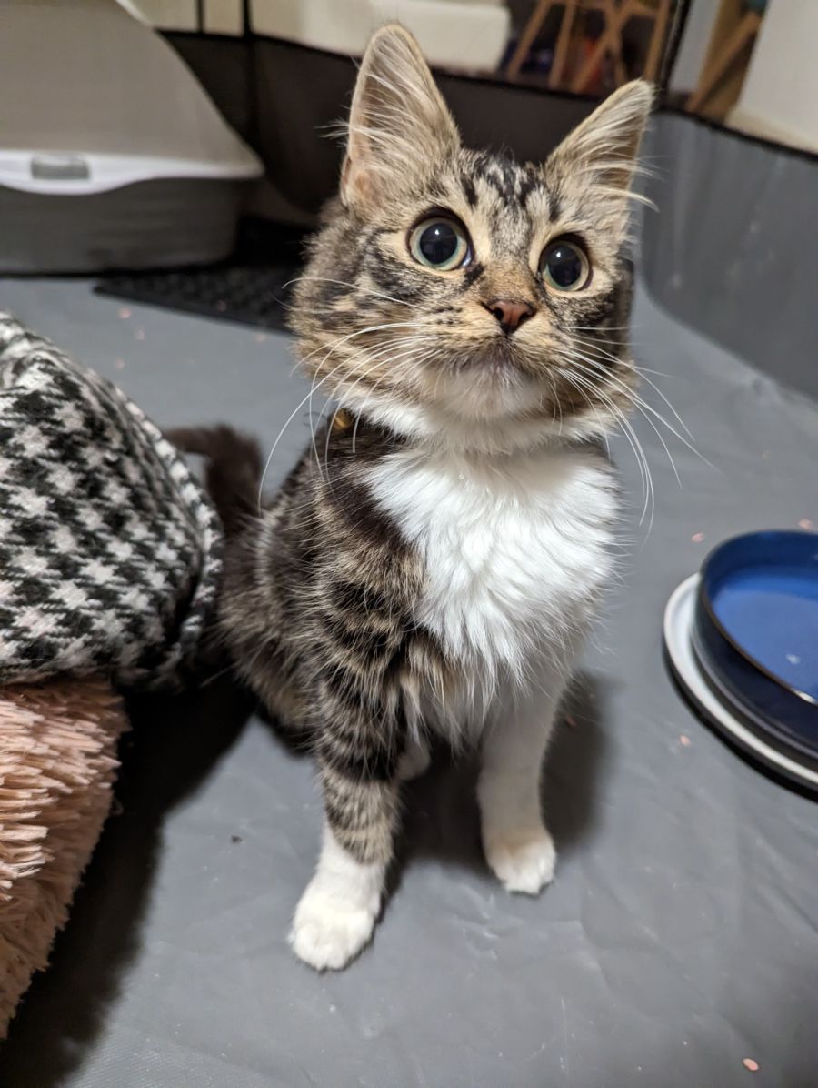 She is a company loving little kitten who loves to play and cuddle. She absolutely adores her foster siblings and will often nap alongside them. She has quickly developed a trust for humans and simply can't resist scratches. At the moment, she comes when called and starts to purr almost immediately. Millie has gorgeous green eyes that you won't be able to resist.
