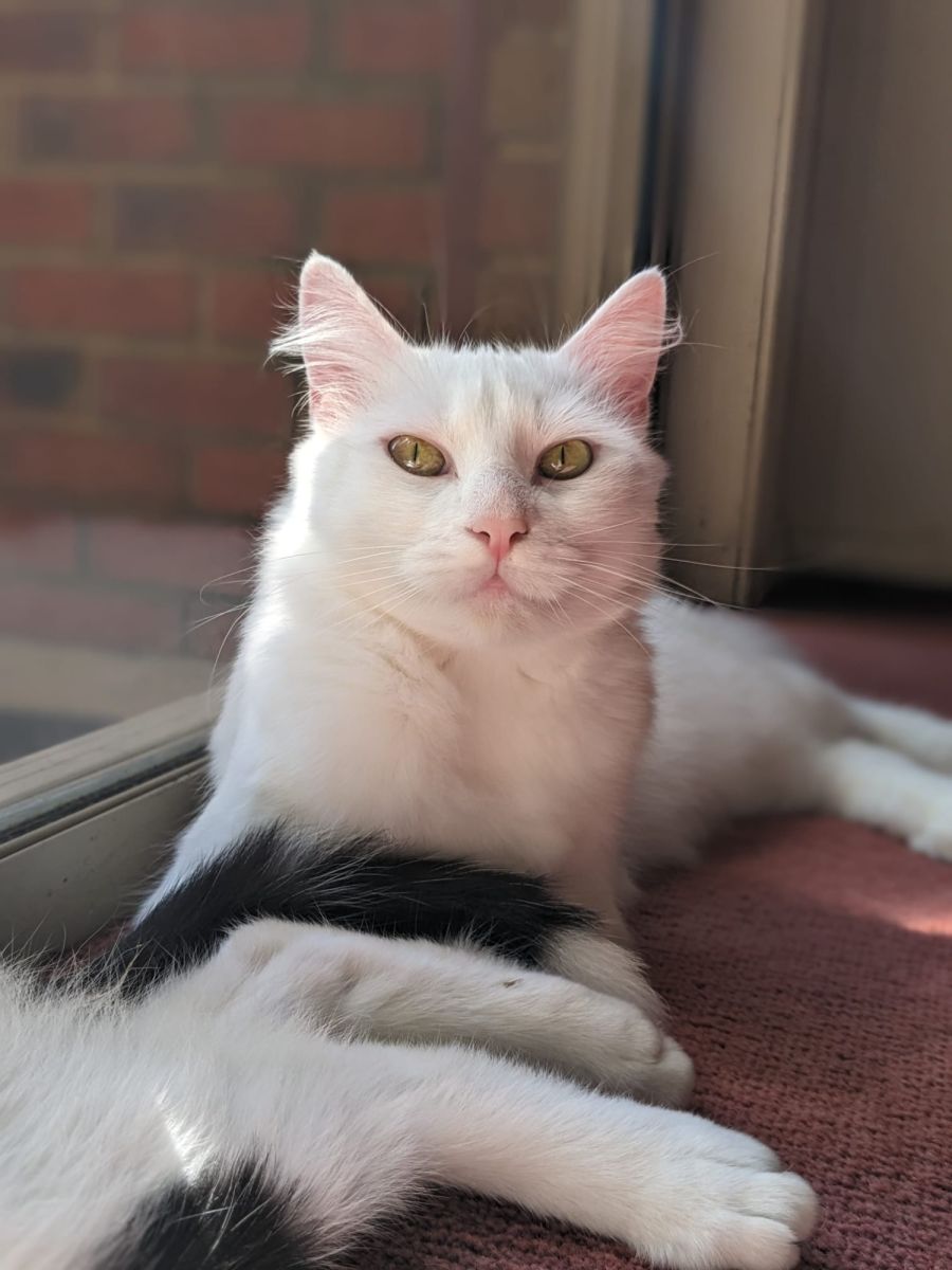 I am polite and only really meow when I need something (usually that's breakfast) I'm a beautiful snow white colour which means I will need to be kept indoors only since I have delicate skin which can burn from too much exposure to the sun. My eyes are my best feature and my fur is as soft as silk, did I mention I'm a purr machine? I'll groom you if you let me, and I love knowing what my humans are up to!