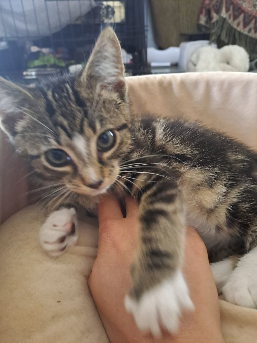 Mittens is a lovable kitten who only need look at you to start purring. Mittens is a domestic short hair male who loves to play and jump around and have fun but then cuddle up with you on the couch afterwards. Mittens currently lives with his 4 other litter mates and is quite social. He has been around young children and dogs and would make a perfect addition to any family.