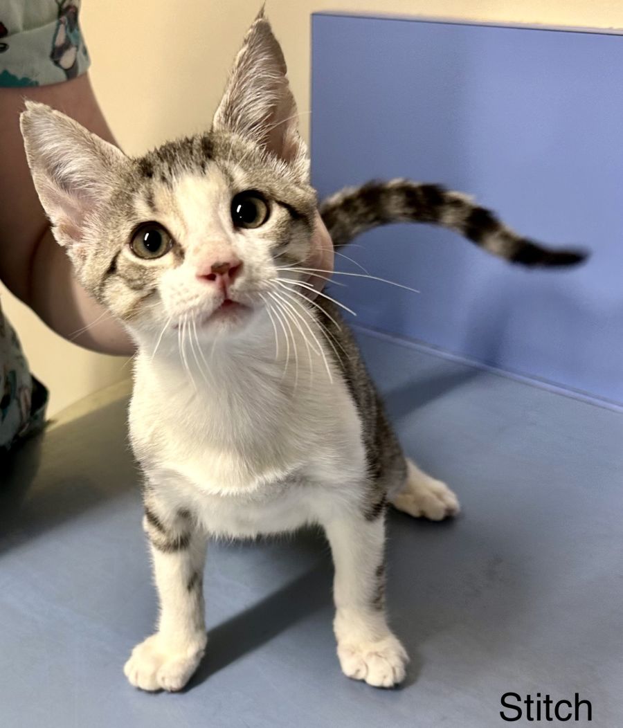 Meet Stitch! This sweet and mischievous kitty loves to play, and all the different ways he finds to entertain himself will keep you laughing all day. Whether it's jumping into his water bowl or playing with other cats, Stitch is always full of personality. His playful nature makes him an ideal companion for any home.