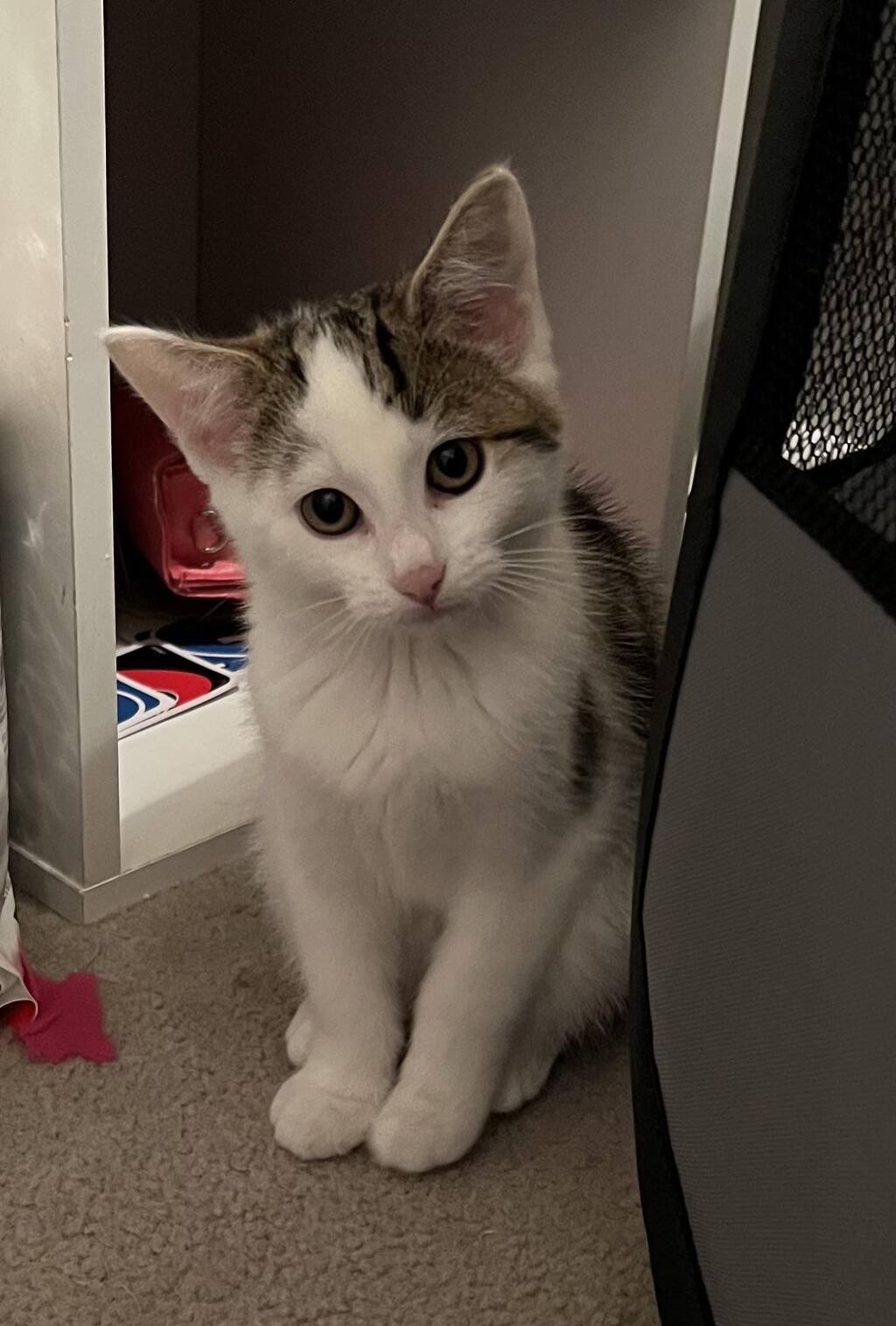 Cob Loaf is a shy, but curious young female kitten. She was taken in with her siblings after being out on the street, so she is still a bit timid around people.