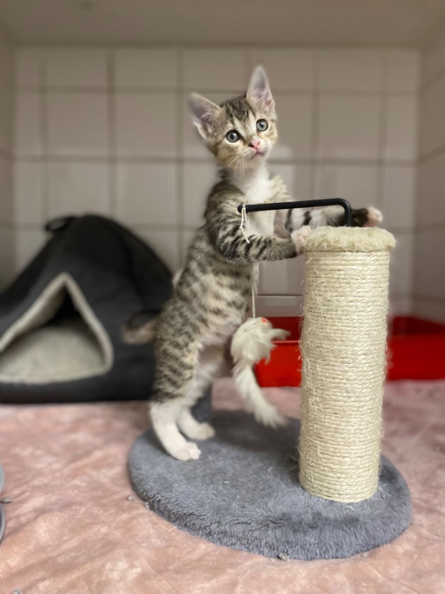 Bunny is an adorable 9 week old Female Tabby Domestic Short Hair Kitten who will win your heart over with her cuteness. She is very affectionate and gentle, always ready to give you cuddles and purrs, making her the perfect companion! Bunny is also a playful kitty who loves to explore, chase after toys and make new friends.