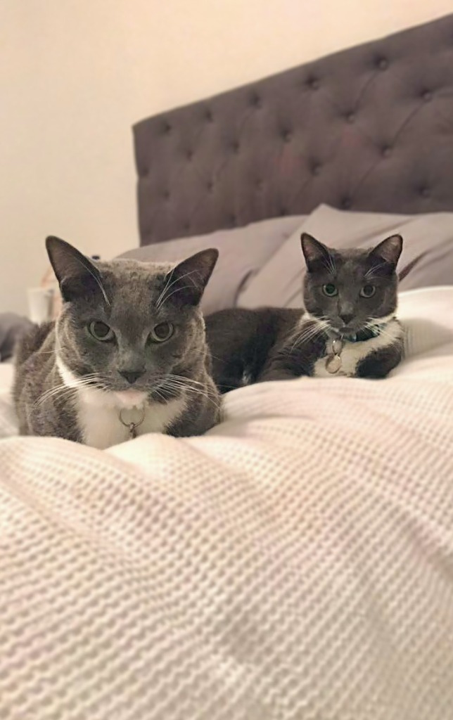 So as you might have guessed it, I'm Kai and my brother Kenji and I are as close as they come. We're bonded for life, from the tips of our white paws to the top of our grey tails. Life without each other wouldn't be worth it. And all we have both ever wanted is to lay our affection on our favourite humans. We love hanging out with people and that includes little humans too, yes siree, we like them quite a bit, and wouldn't hurt a hair on their heads. Kenji is probs a bit shyer around strangers than me, I am quite the confident guy, but don't get me wrong, he is fine when we're together. He even has a magic trick - which baffles me - he can open push handle doors with his paws. Clever guy! And unlike those 'other' Special Ks, we're the sweetest, gentlest, most loving, easy going boys you could have around. I mean look at us! Aren't we handsome? Don't we look super cute spooning each other? As strictly indoor cats, we currently have a cat run so we can get some fresh air and sunshine, while bird watching and staying safe. Can you imagine waking up and being greeted by gentle meows and soft rubs times two? Well then, if you do want to wake up to us every day, make us - Kai and Kenji - your two best new good boys, the one (two) and only, Special Ks!!!