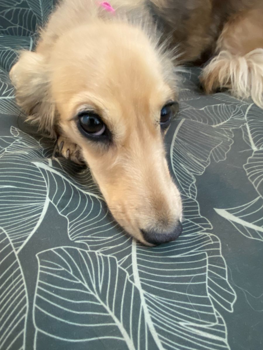 Elodie is mildly ataxic, she has some calcified discs and a narrowing of some spaces between some discs. (X rays and veterinary notes will be made available to adopter). She is not in any pain. She has very short legs even for a dashie. As a result she is a quiet girl, she loves, loves her short walks during the day (these are important for her to maintain muscle mass) but other than that she is content to lay about or potter about in the garden with you.