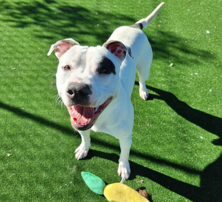 Junior, also known affectionately as Chunk JR by staff, is a BIG excitable boy with lots of energy! Junior is a very boisterous and friendly boy but he is very strong and doesn't know his own size. Junior will therefore need training and a strong handler. He has socialised well with both male and female dogs as he just wants to play with them! He can be a lot for other dogs though because of this so he may need to be taught some manners. Junior would suit a teenager/adult household