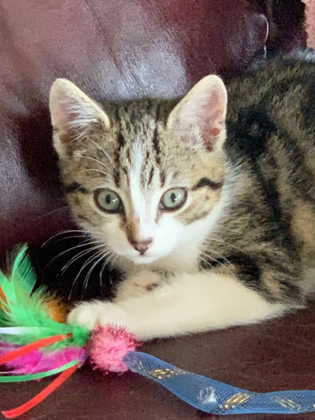 Vanilla Spice is a curious fun loving young kitten, who is growing in confidence after initially being very timid and wary of people and good at finding hiding spots when scared.