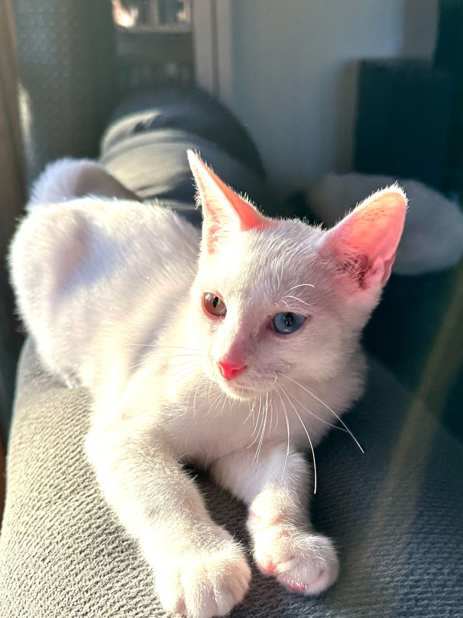 Hi, my name is Bowie, and I got that name as I have heterochromia, which means that my eyes are two different colours, just like David Bowie, who I was named after. I also have the cutest tail, I may be a bit biased as it my own, but it curls all the way and sits on my back like a curly pig tail. It sits on my back when I am happy, which lets be honest is all the time so it is always perched on my back.